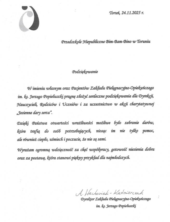 Otrzymaliśmy podziękowania od Dyrektora Zakładu Pielęgnacyjno-Opiekuńczego za udział w akcji “Jesienne dary serca”