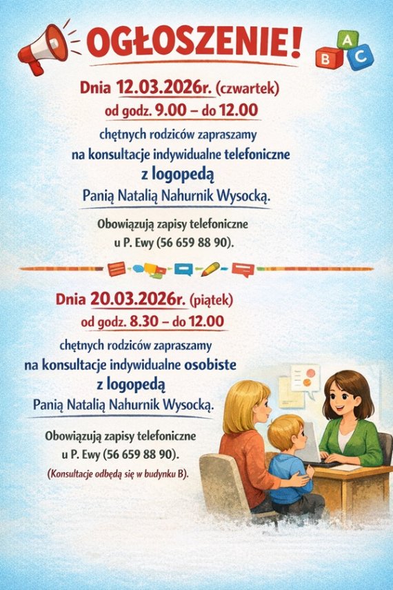Obowiązują zapisy telefoniczne pod przedszkolnym nr tel. 56-659-88-90.